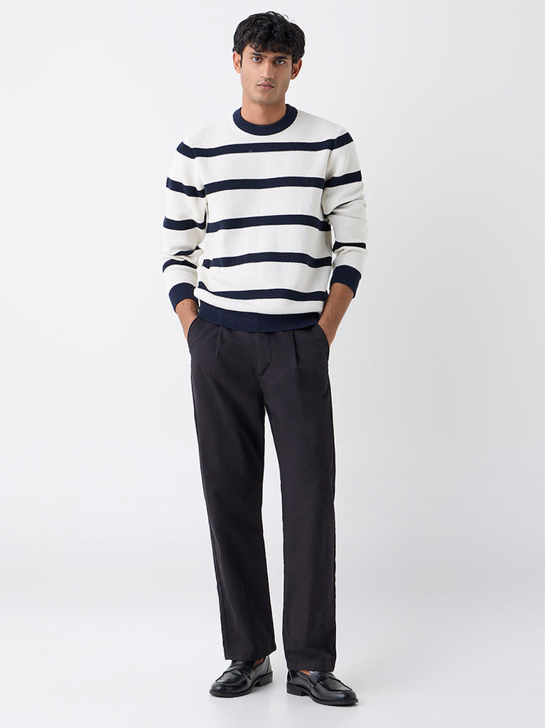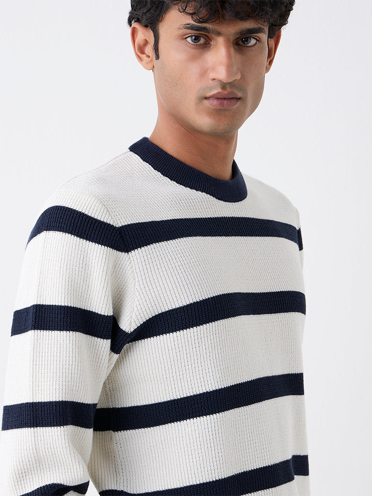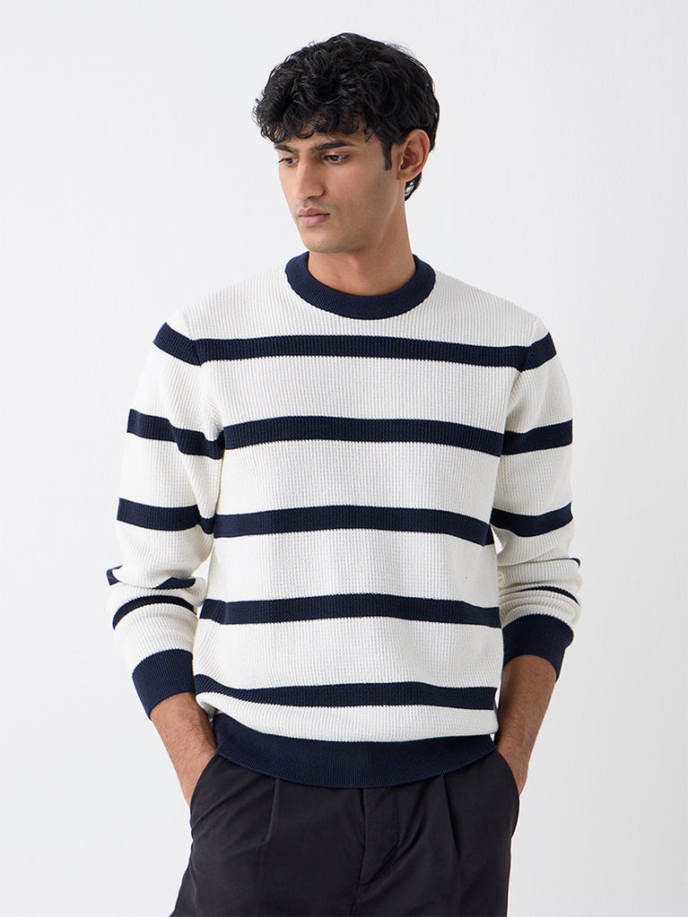 Ascot White Striped Relaxed-Fit Cotton-Blend Sweater