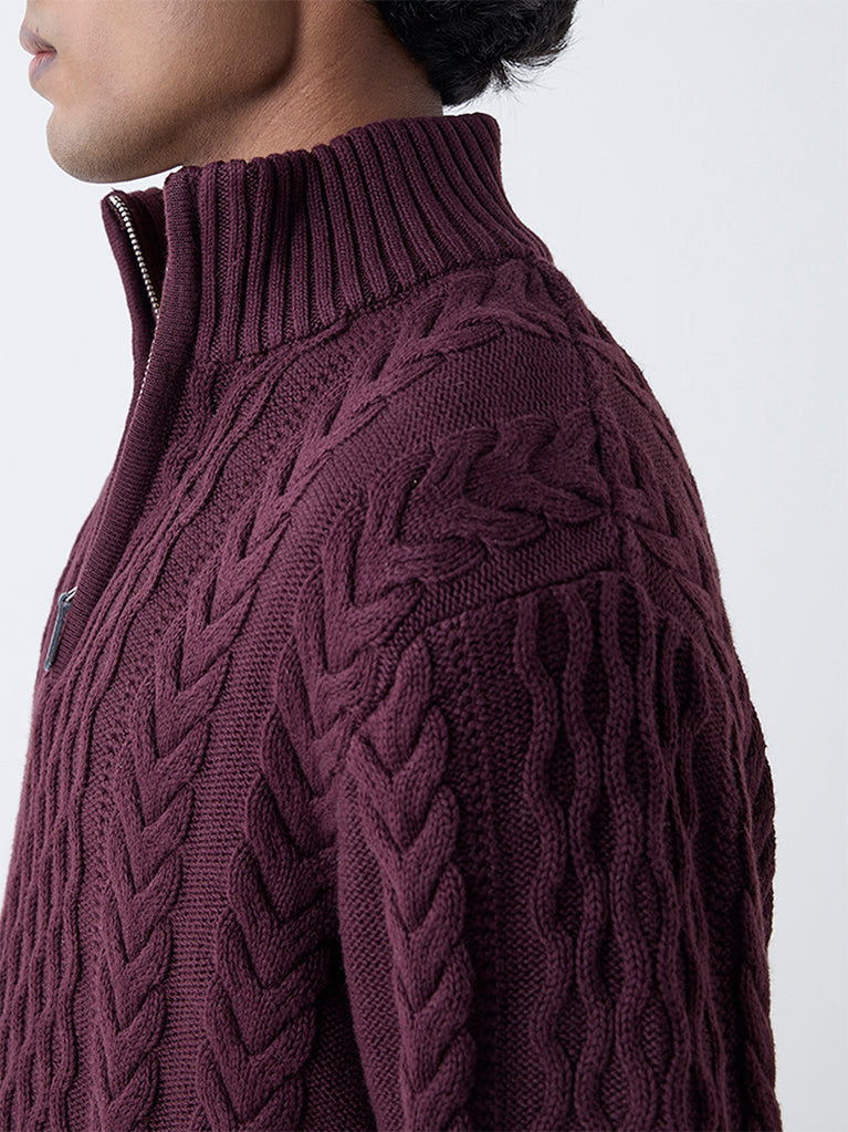 Ascot brings this wine sweater, woven from pure cotton and detailed with a cable-knit pattern that adds texture and character. Featuring a high neck, a short zipper closure and full sleeves, it combines practicality with refined design. Comfortable and timeless, it serves as a go-to layer for cool-weather styling