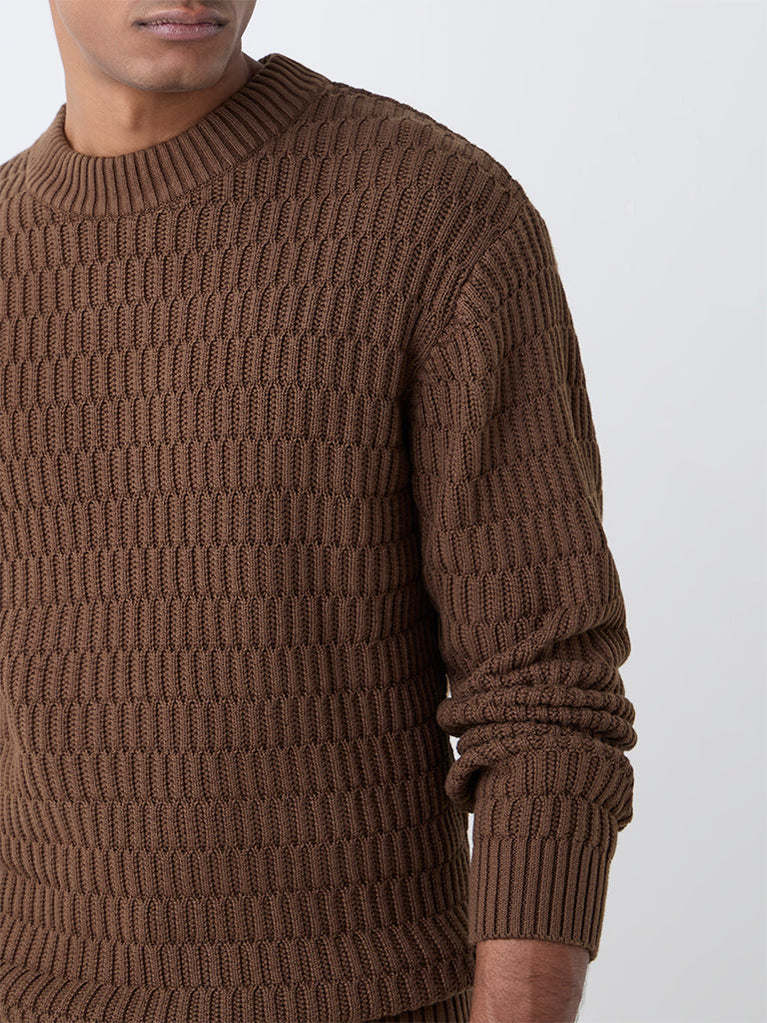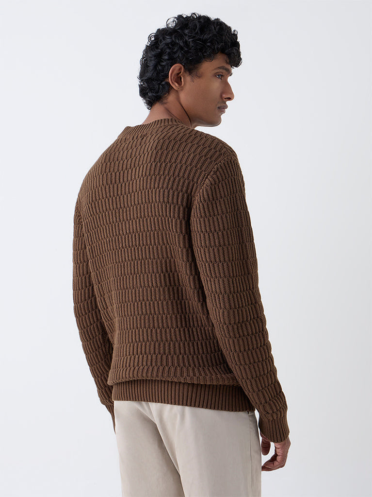 Ascot Brown Knit-Textured Relaxed-Fit Cotton Sweater