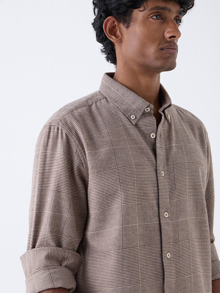 Ascot Taupe Checkered Pattern Relaxed-Fit Cotton Shirt