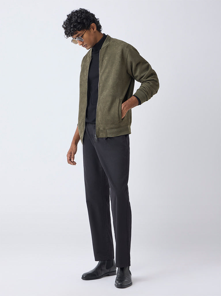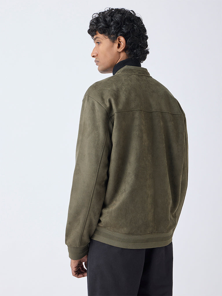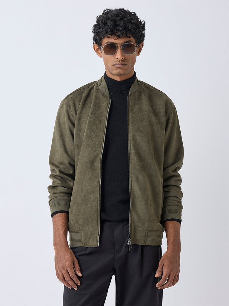 Ascot’s olive suede jacket channels elevated off-duty style with its relaxed handle and luxe texture. The ribbed stand collar adds an athletic edge, complemented by a clean zipper placket and full sleeves. Side pockets anchor the piece in everyday practicality ideal for weekend drives and easy layering.
