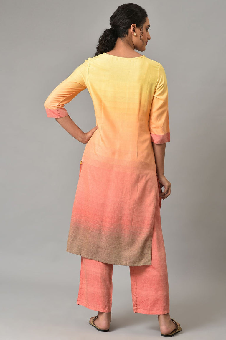 Pouring The Colours From The Dusk Sky, This Kurta Features A Romantic Ombre Colours And A Delicate Embroidey On The Neckline. This Ensemble Comes With A Cotton Straight Palazzo And An Elegant Printed Soft Cotton Dupatta. Dial It Up For A Perfect Day Or A Special Evening.