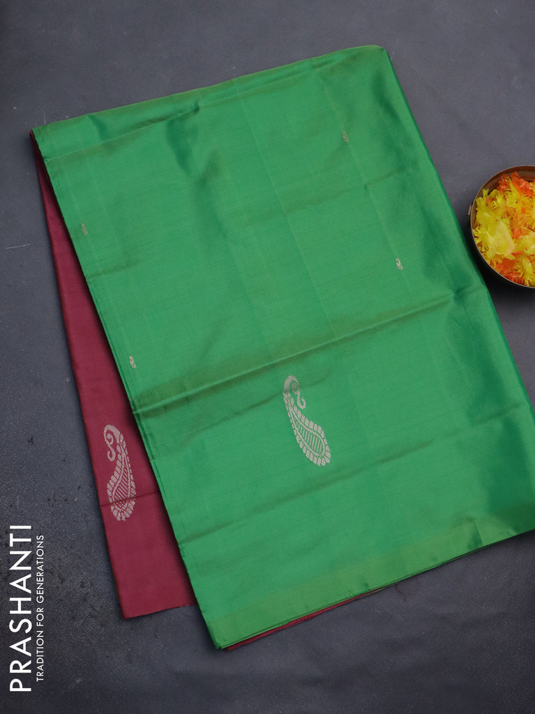 Banana pith saree green and maroon with thread woven buttas in borderless style