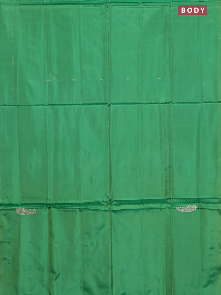 Banana pith saree pale yellow and teal green shade with thread woven buttas in borderless style
