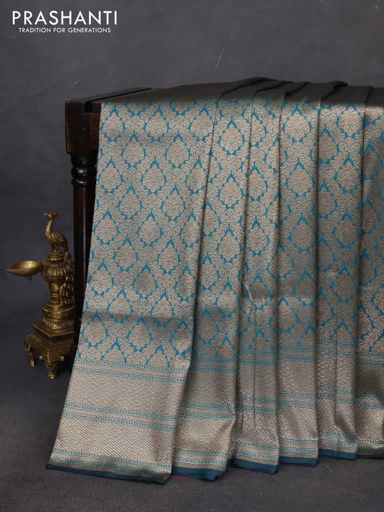 Banarasi semi katan saree teal blue with allover thread & zari woven brocade weaves and woven border