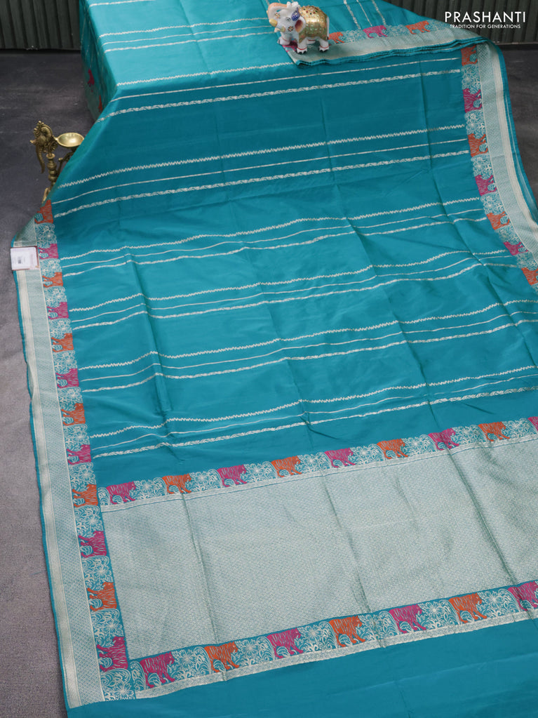 Banarasi semi katan silk saree teal green with allover silver & gold zari weaves and deer design zari woven border