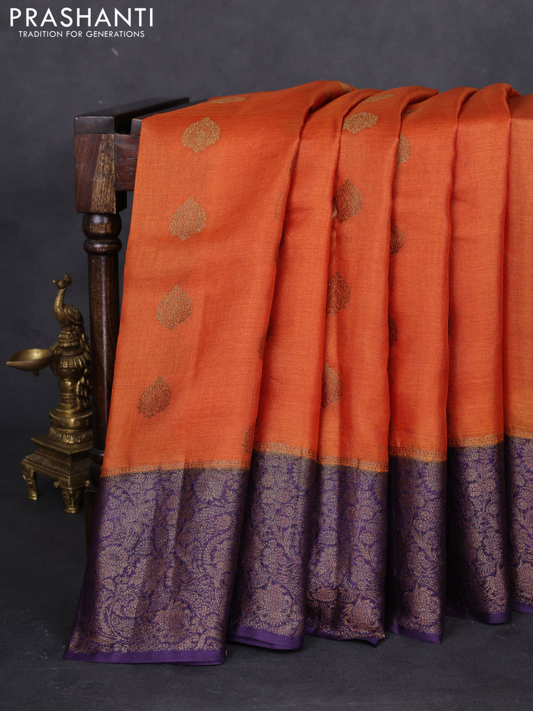 Banarasi tussar silk saree orange and violet with thread & zari woven floral buttas and woven border