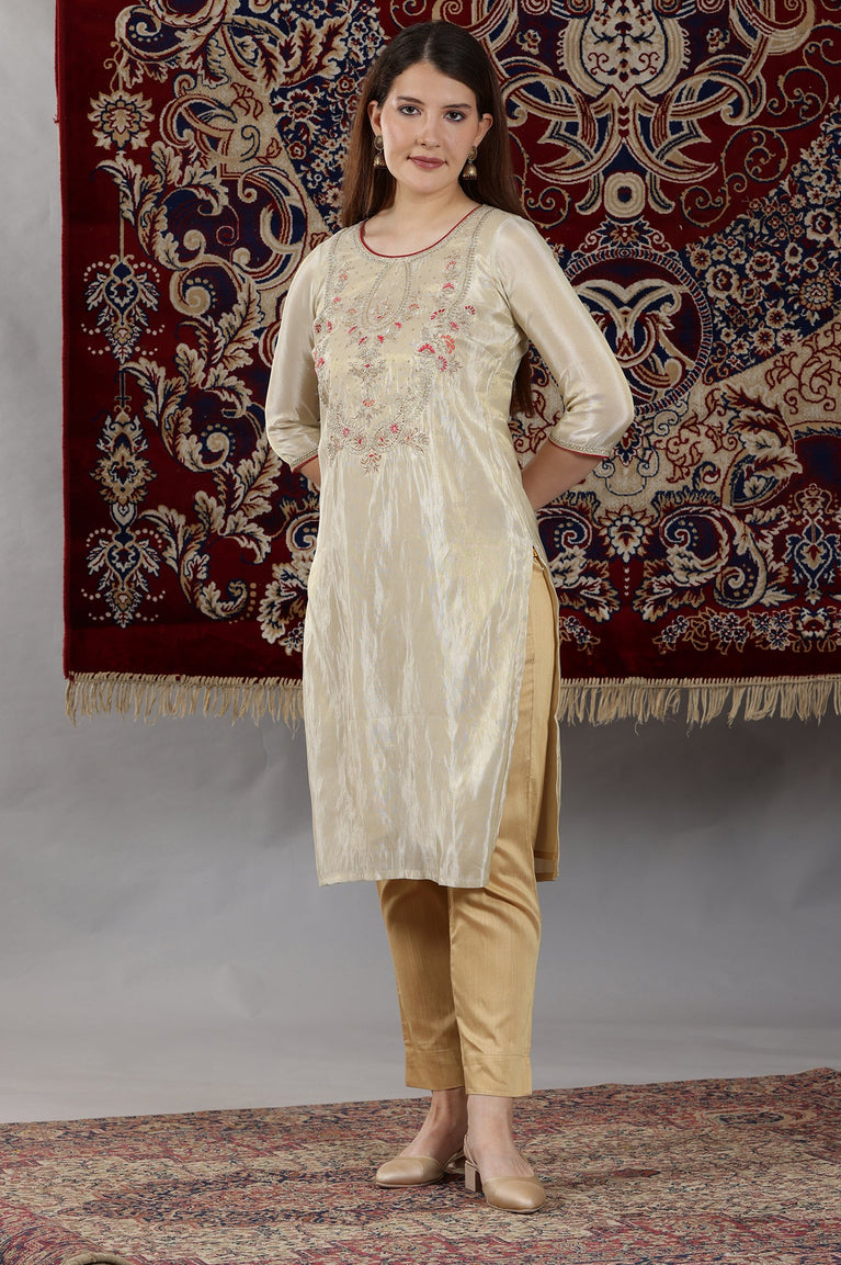 Beige Dori Embroidered Yoke Straight Festive Kurta