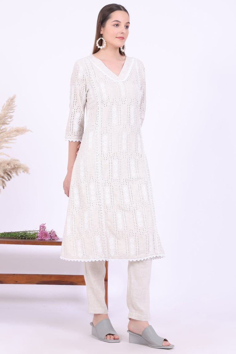 Beige Embroidered A-Line Kurta & Trousers Set