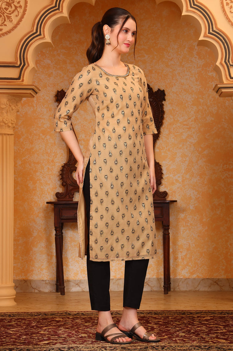Elevate your ethnic wardrobe with this exquisite women's kurta, crafted from a luxurious blend of 82% cotton and 18% silk. The beige-hued garment features intricate embroidery, adding a touch of elegance to its straight silhouette. The keyhole neckline and three-quarter sleeves offer a perfect balance of style and comfort. This woven kurta is ideal for elevated occasions, allowing you to make a sophisticated statement. The new cotton silk fabric ensures a soft and breathable feel, making it suitable for extended wear. Embrace the fusion of traditional and contemporary design with this versatile piece that effortlessly combines comfort and style. Pair it with stylish sandals to complete the look, exuding effortless elegance. Versatile and timeless, this outfit is perfect for making a statement at any occasion, day or night.