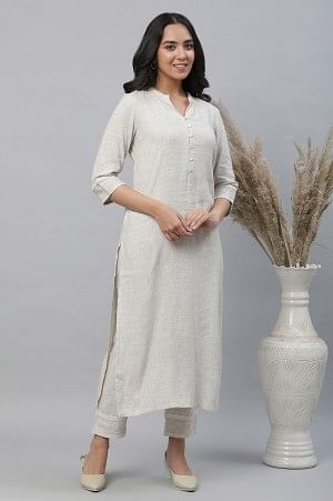 Step out in our latest co-ord set, made from the finest rayon flax slub fabric, featuring a stylish mandarin collar with a delicate lace patch.The top flaunts a unique v-slit neckline with loops and shell buttons for a touch of elegance. The three-fourth sleeves are adorned with tonal silk lace patch, and the pin-tucked cuff adds a subtle detail to the design. The set includes a basic trouser that complements the top perfectly. Get ready to turn heads with this stunning ensemble.