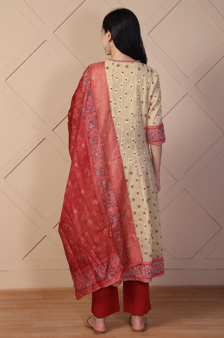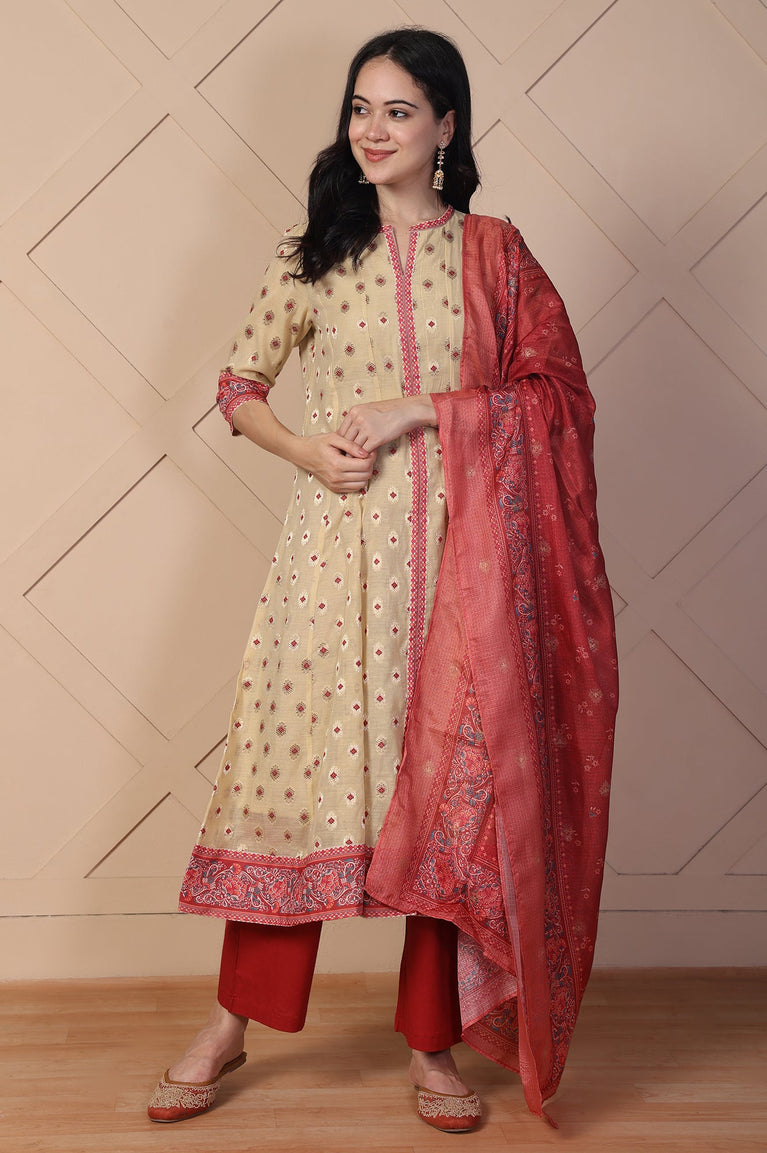 Beige Jacquard A-Line Kurta with Palazzo and Dupatta Set