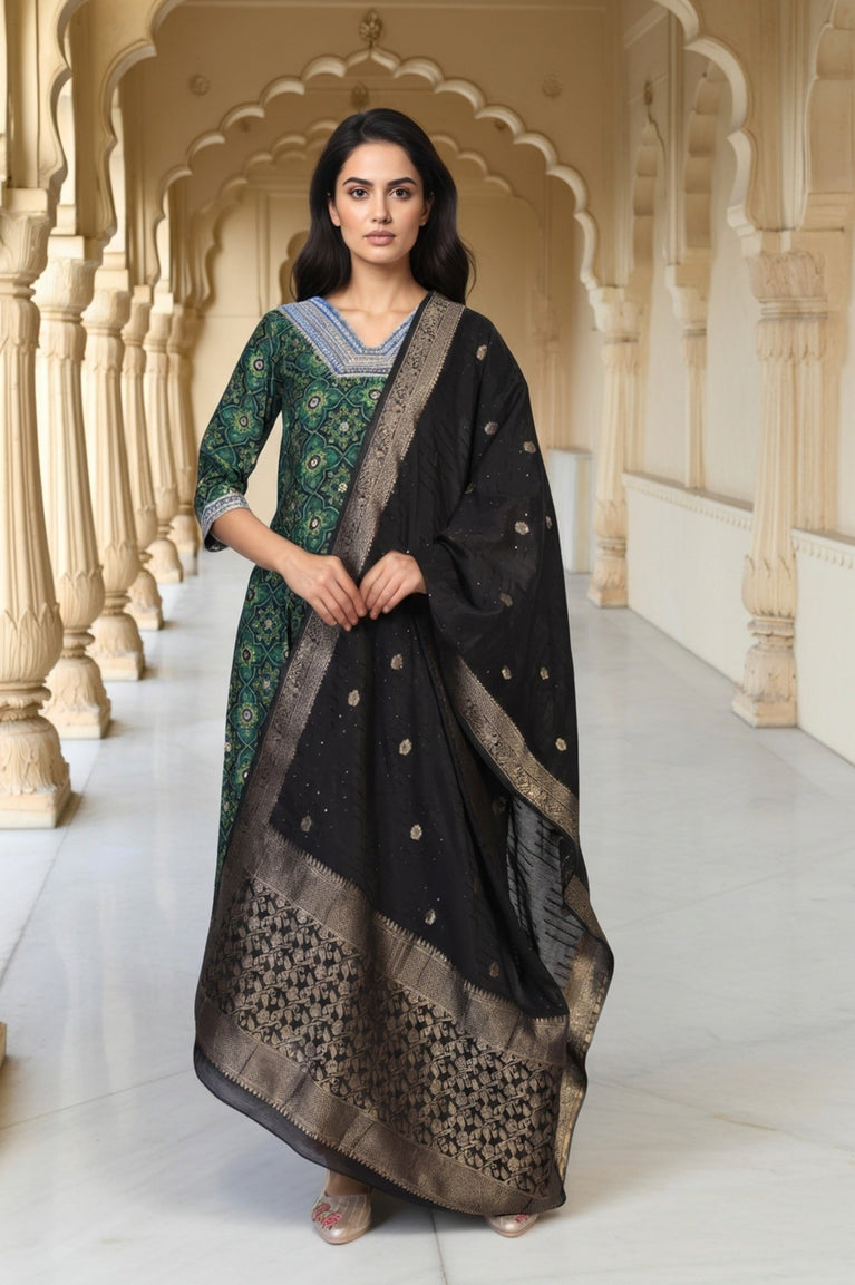 A shadow woven with golden light, this stunning designer dupatta for women in classic Black is a masterpiece of textile art. The main body, a canvas of semi-sheer fabric, is thoughtfully dotted with delicate woven buttis that catch the light with every movement. This ethnic dupatta finds its true splendor in the magnificent, wide border, where a dense jacquard weave brings intricate floral and traditional motifs to life using shimmering zari threads. It's a festive woven stole that tells a story of heritage craftsmanship. Offering a graceful drape, its generous length of over two meters and ample width allow for versatile, elegant styling. Whether draped as a classic stole or a traditional wrap, it floats effortlessly, the opulent border providing a beautiful, regal contrast. It's the perfect lightweight party dupatta for festive celebrations, weddings, or any grand occasion. This black jacquard dupatta with zari border is an heirloom-quality piece that adds a touch of royal elegance and sophisticated charm to any wardrobe.