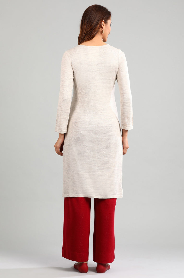 Beige round neck solid kurta with button placket on the front and roll-up sleeve detail.