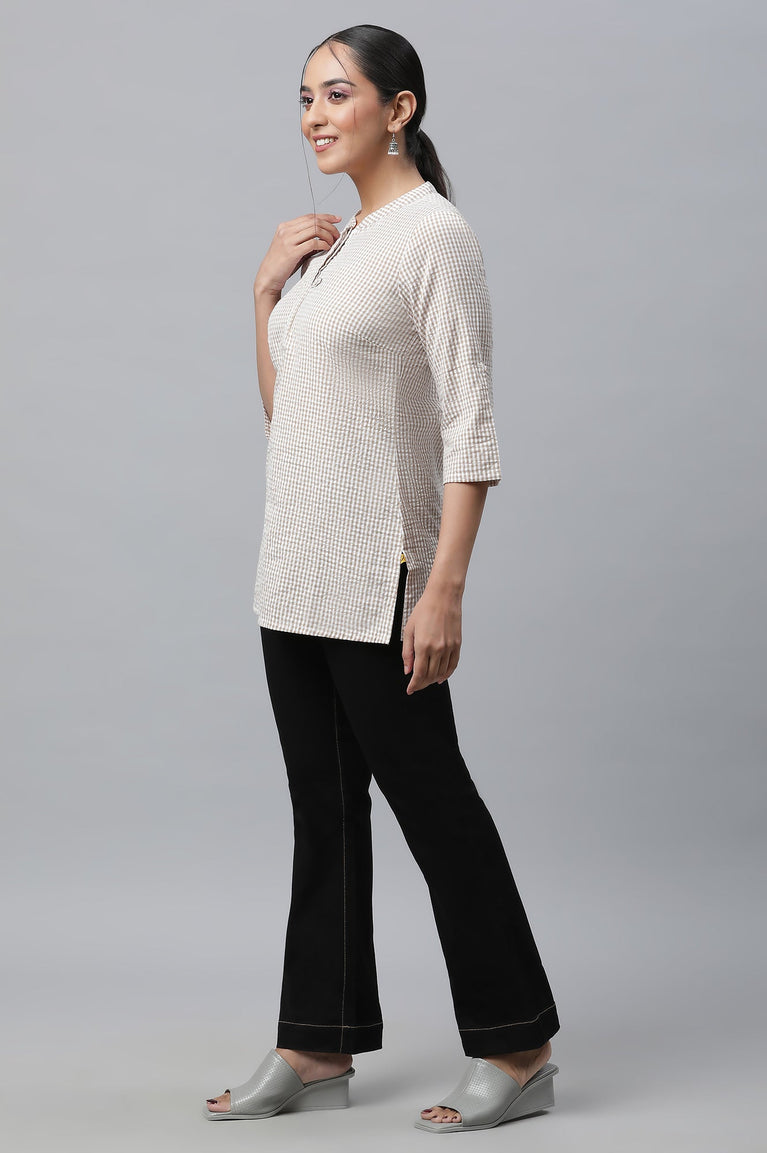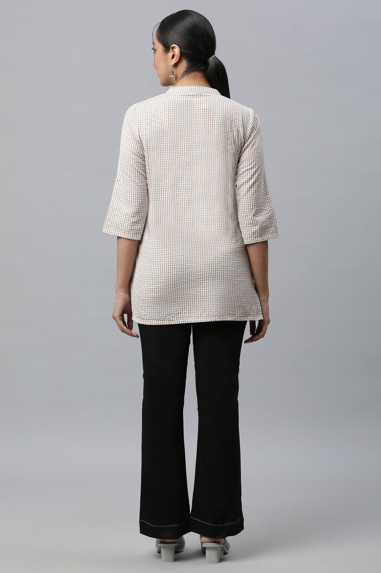 Beige round neck half sleeve kurta with neck detailing and roll-up tab feature on the sleeves.