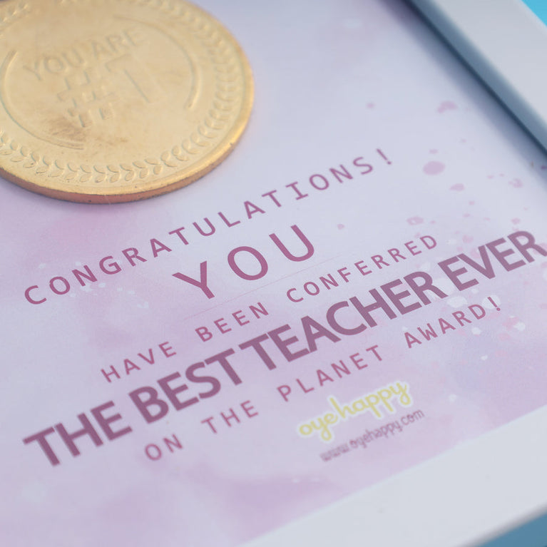 Teachers deserve all the appreciation in this world for everything they do. Give your favorite teacher the ultimate compliment with our Best Teacher Certificate. This sweet and adorably funny frame comes with a medal (yes, a real medal) that certifies your Teacher as the Best Teacher Ever. Go ahead, make their day!Specifications:Size of the Frame: 12.5 x 17.5 cmMaterial of the Frame: WoodSize of the Medal : 5 x 5 cms