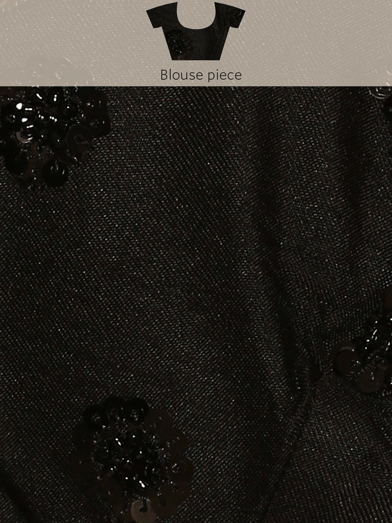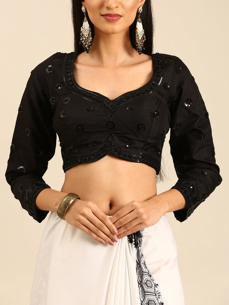 This black and white satin saree features elegant printed patterns enhanced with delicate hand embroidery, offering a timeless and refined look. Crafted for comfort and style, it comes with a ready-made blouse, making it easy to wear for any special occasion. Perfect for those who appreciate classic sophistication with a modern touch.The saree is accompanied by a stylish, ready-made blouse designed to complete your look.