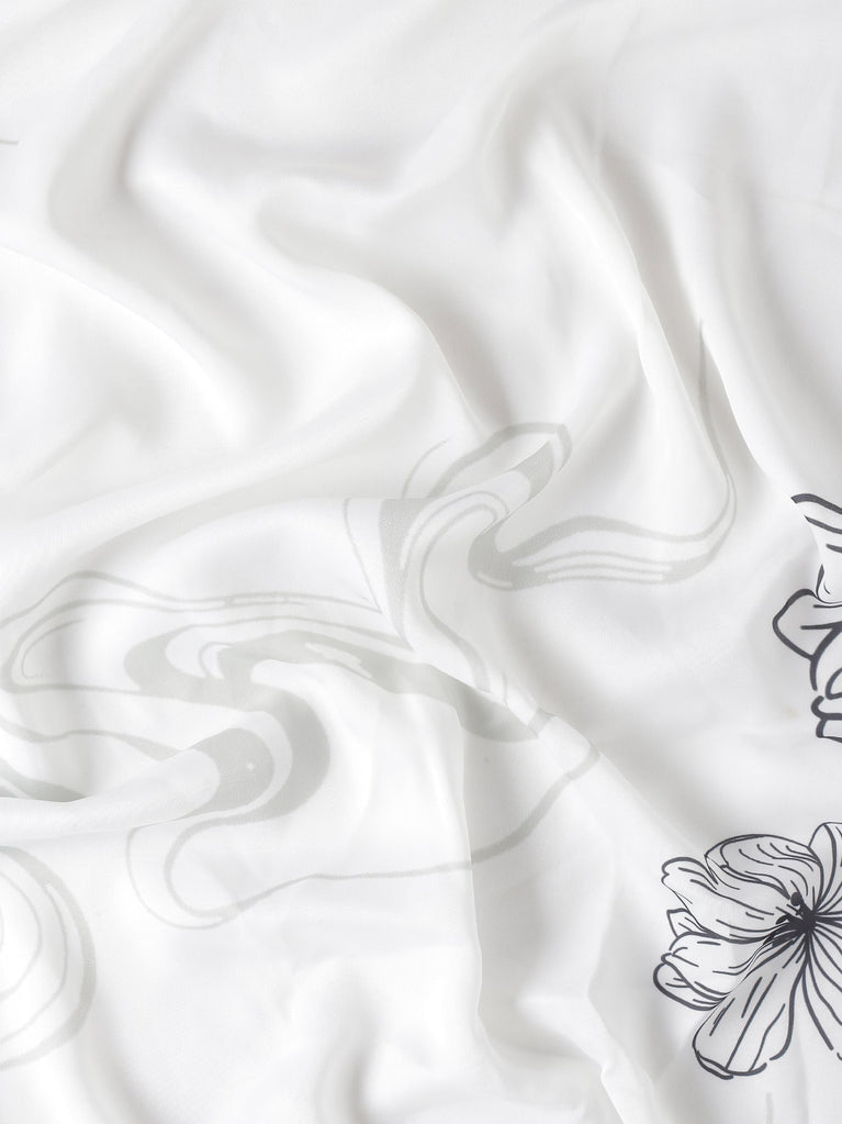 This elegant black and white satin saree features exquisite hand embroidery that adds a refined touch to its printed design. Crafted from smooth satin, it drapes beautifully, offering both comfort and style. The saree comes with a ready-made blouse, ensuring a perfect match and ease of wear for any special occasion.