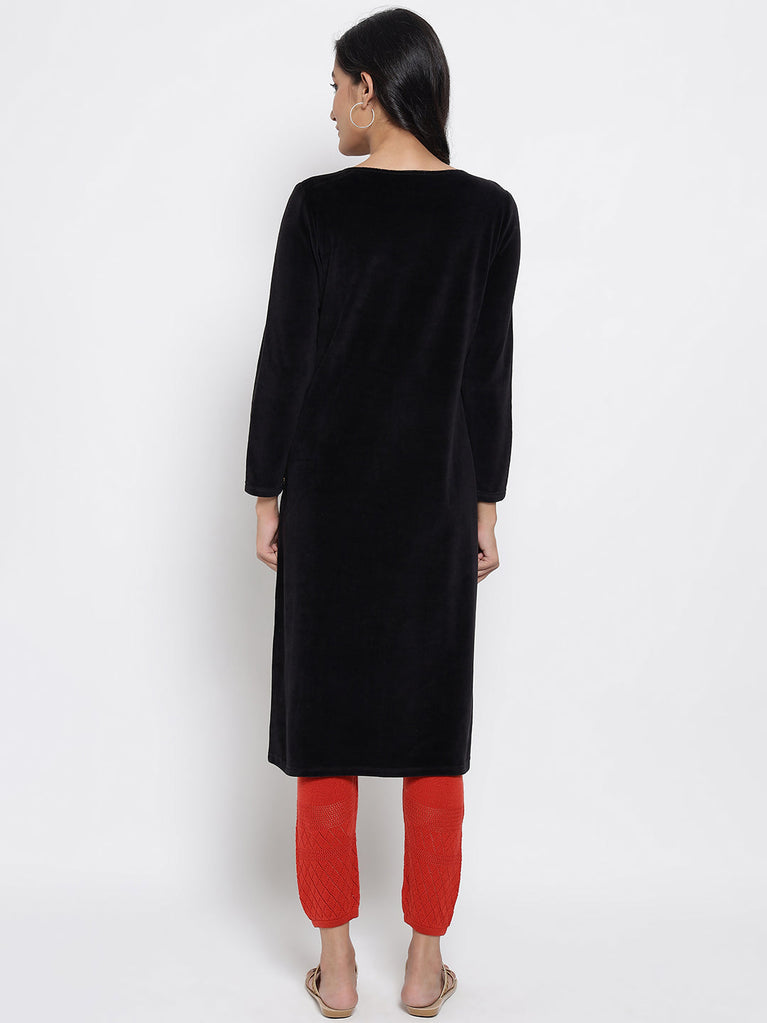 A winter wardrobe essential that speaks volumes in its subtlety. This A-line kurta for women is rendered in a deep Onyx Black, offering a canvas of quiet sophistication. Its true charm lies in the exquisite details that set it apart. A graceful V-neckline is delicately traced with fine lace, adding a touch of romance and intricate texture to the simple silhouette. The full-length sleeves become a focal point, culminating in a stunning burst of vibrant floral embroidery that provides a captivating contrast against the dark, solid fabric. A whisper of matching lace at the cuffs harmoniously echoes the neckline's design. This elegant apparel is crafted from a soft, warm fabric that drapes beautifully, falling to a modest calf length with a clean, straight hemline and functional side slits for ease of movement. The solid, unadorned body ensures all attention remains on the exquisite ornamentation. You'll find this opaque long sleeve winter kurti is a piece you reach for repeatedly for its perfect blend of cozy comfort and undeniably refined style.