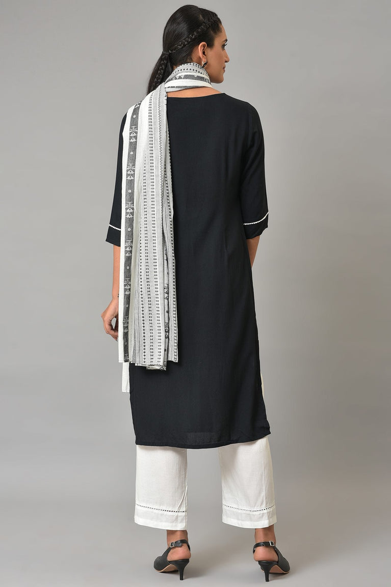 Black Floral Thread Embroidery Straight Woven Kurta with Flared Pant and Dupatta Set
