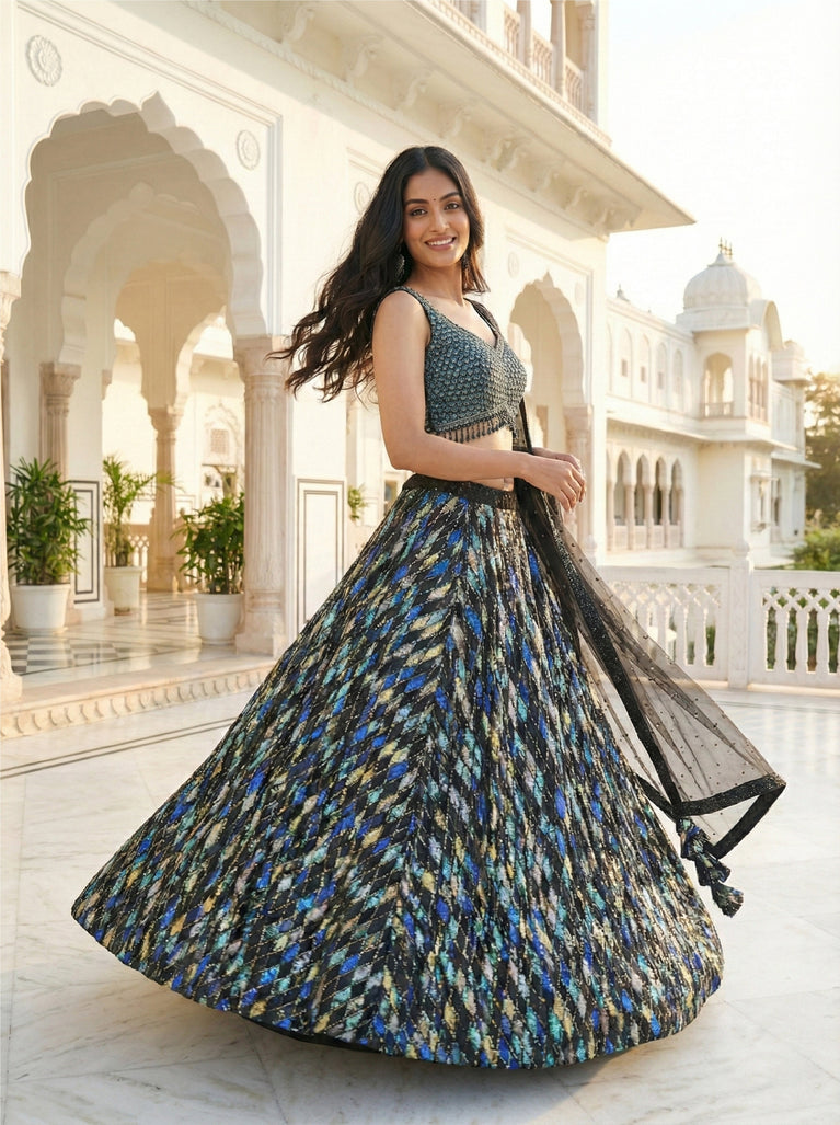 Elevate your traditional wardrobe with this Black Net Sequins Work Ghagra Set. Crafted from delicate net fabric and adorned with shimmering sequins, it offers a graceful silhouette and subtle shine perfect for festive occasions. The ensemble combines elegance with comfort, making it an ideal choice for celebrations where style meets sophistication.