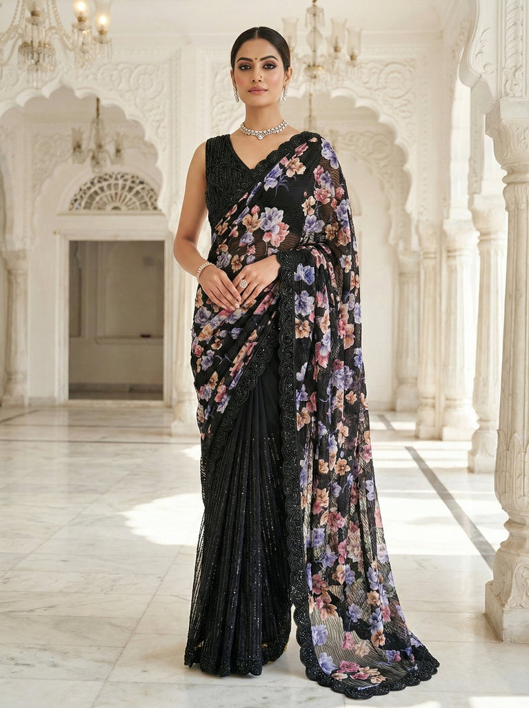 Black Net Heavy Floral Sequins And Beads Saree With Readymade Blouse