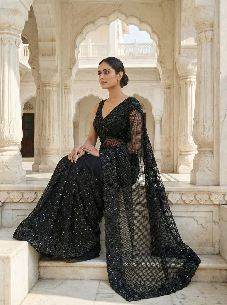 Elevate your elegance with this stunning black net saree featuring intricate heavy hand embroidery embellished with shimmering sequins. Its delicate craftsmanship highlights a luxurious texture, perfect for making a bold statement at any special occasion. Experience the blend of traditional artistry and modern allure that ensures you stand out with grace and sophistication.