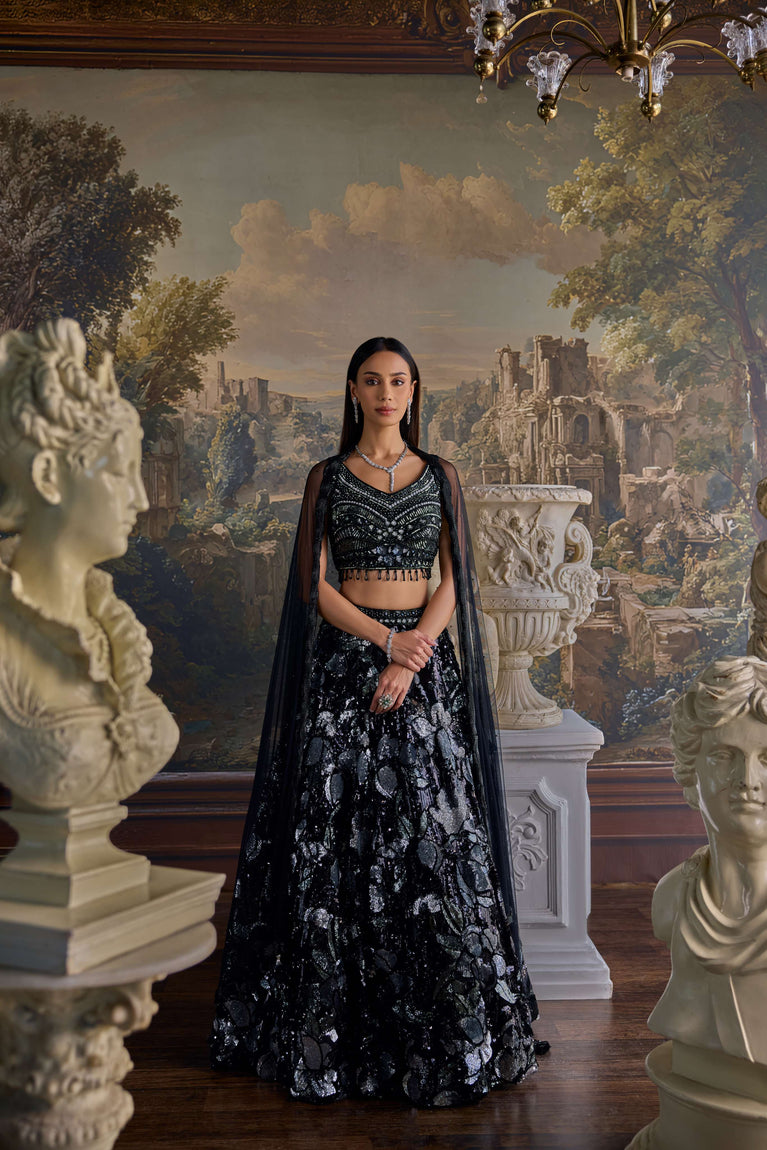 Black Net Heavy Sequins And Floral Embroidered Ghagra Set