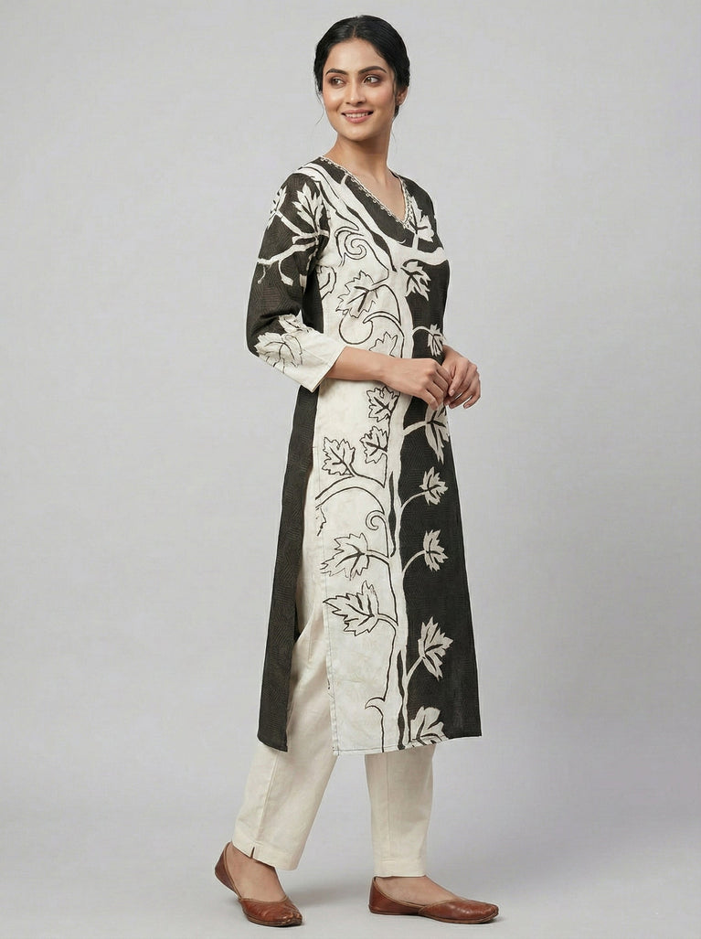 Discover the perfect blend of comfort and style with this exquisite ethnic kurta. Crafted from 100% viscose, this woven garment offers a luxurious feel against your skin. The three-quarter sleeve length adds a touch of elegance, making it suitable for various casual occasions. The black kurta features a captivating geometric print that adds a modern twist to the traditional design. Its A-line silhouette flatters various body types, creating a graceful and flowing appearance. The band neckline adds a subtle sophistication to the overall look. Made from rayon, this kurta ensures breathability and ease of movement throughout the day. Whether you're attending a family gathering or a casual outing with friends, this ethnic kurta is sure to make a lasting impression with its unique blend of contemporary and traditional elements.