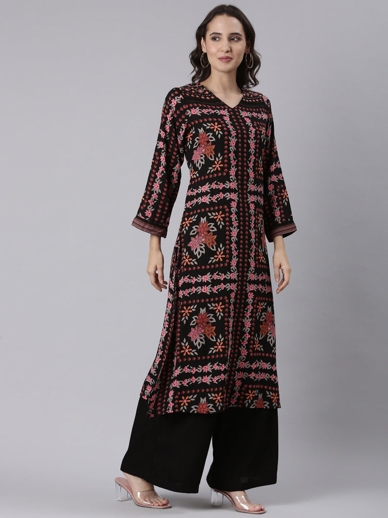 Black Rayon A-Line kurta With Asymmetric Hemline