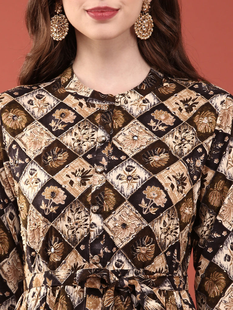 Elevate your wardrobe with this sophisticated black rayon long dress, featuring an exquisite floral digital print. Crafted from premium rayon fabric, this piece offers a luxurious drape and exceptional comfort for all-day wear. The intricate floral design adds visual depth and elegance, making it versatile enough for both casual outings and semi-formal occasions.