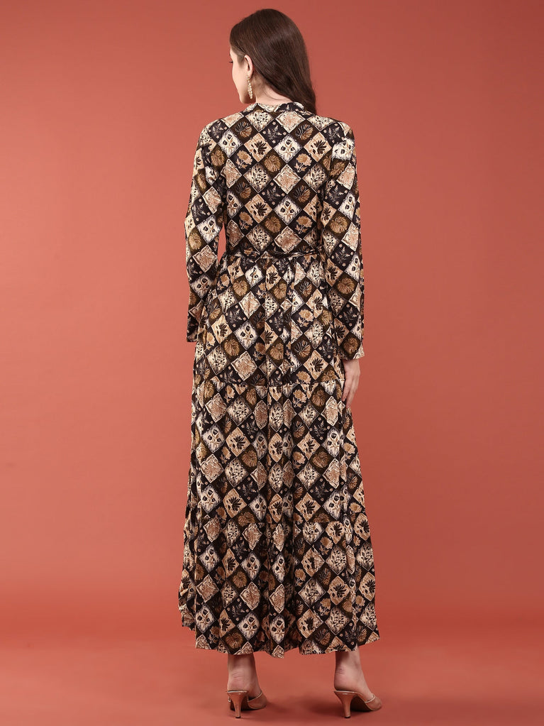 Crafted from luxurious rayon, this black printed long dress combines comfort with sophisticated style. The fluid fabric drapes elegantly, creating a flattering silhouette perfect for both casual outings and semi-formal occasions. The intricate print adds visual interest while the classic black base ensures versatility in your wardrobe. Ideal for layering or wearing solo, this piece transitions seamlessly from day to evening wear.