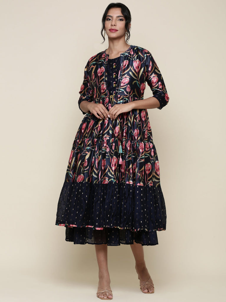 This Black Silk Floral Printed Jacket and Gown set exemplifies refined elegance through its rich black silk fabric and delicate floral print. The jacket is tailored to enhance your silhouette, complementing the flowing gown that offers both comfort and poise. Perfect for upscale events, this ensemble combines luxurious texture with sophisticated design, ensuring a polished and timeless look.
