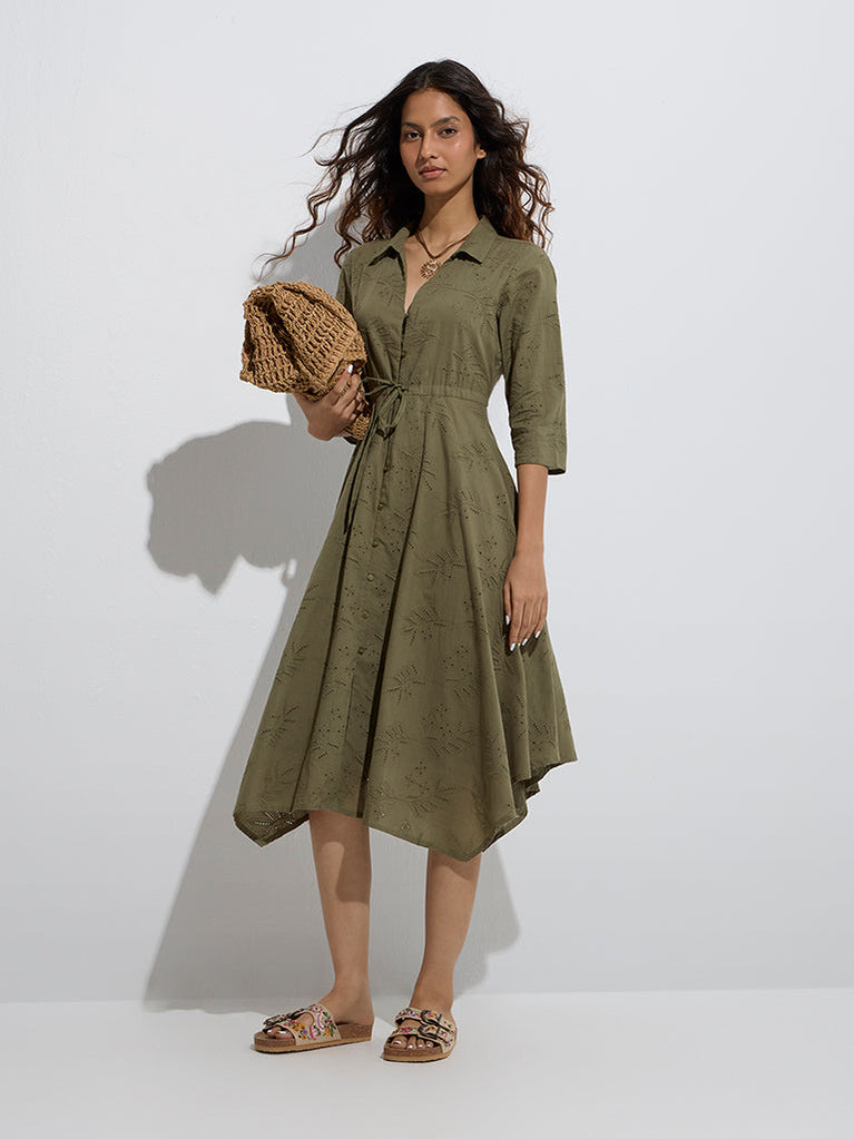 Bombay Paisley introduces this olive dress adorned with intricate schiffli detailing. Spun from pure cotton, it features a V-neck collar extending to a button placket and three-quarter sleeves. The drawstring waist adds a customizable fit, defining the silhouette with effortless charm.