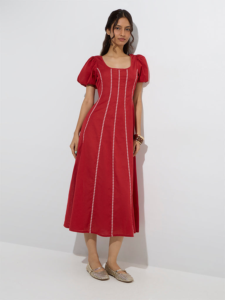 Shaped in a flattering A-line silhouette, this red dress from Bombay Paisley flaunts intricate embroidery that adds subtle artistry. Its breathable composition combines comfort with style, while a scoop neck, puff sleeves, and a back zipper ensure effortless wear.
