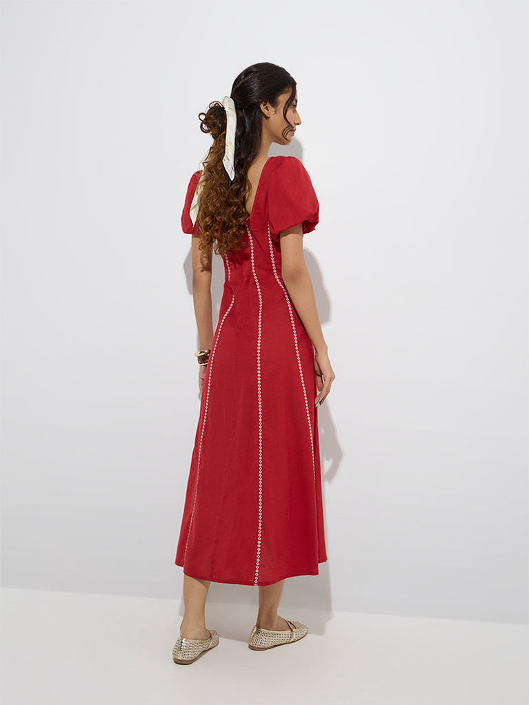 Bombay Paisley Red Embroidered Cotton-Blend A-Line Dress