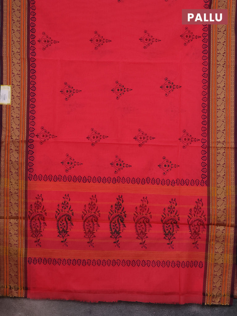 Chettinad cotton saree candy pink and wine shade with allover block prints and thread woven border