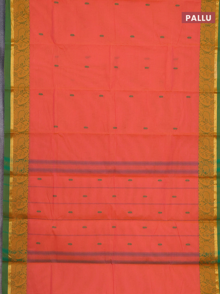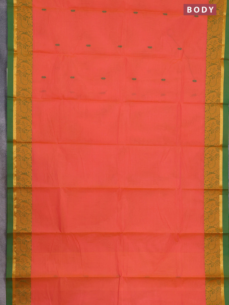 Chettinad cotton saree dual shade of pinkish orange and green with thread woven buttas and thread & zari woven border