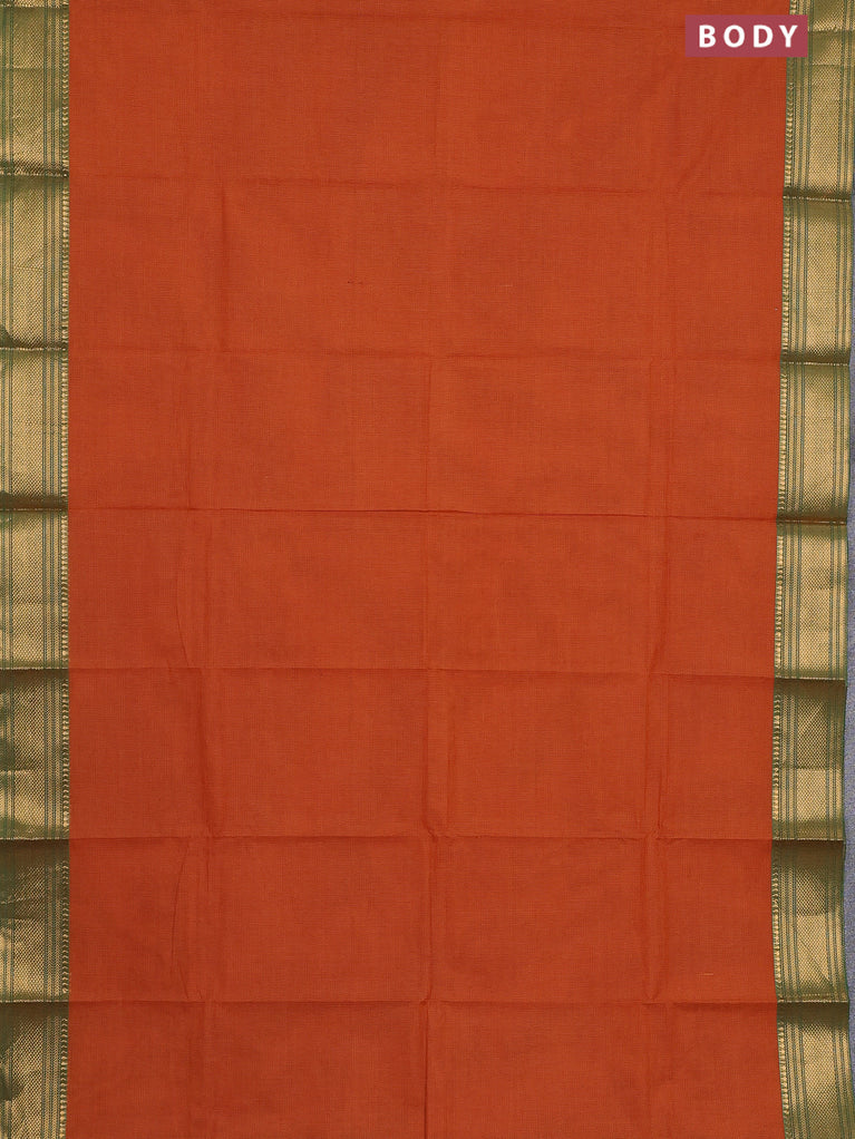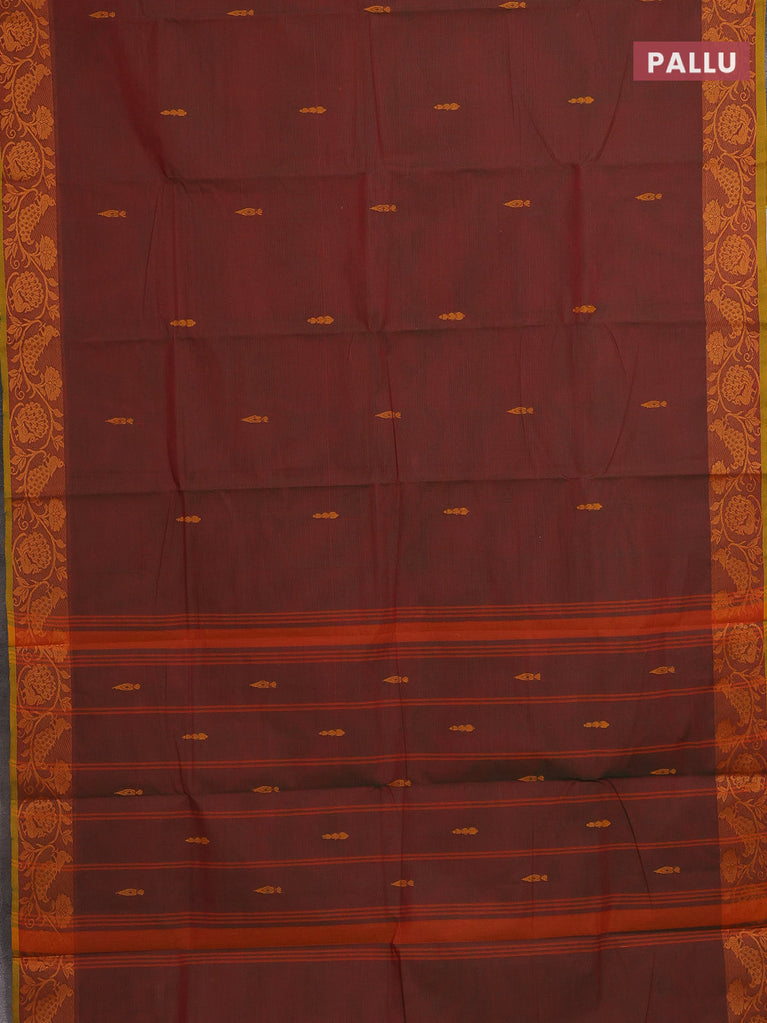Chettinad cotton saree dual shade of greenish maroon and dark mustard with butta prints and zari woven border