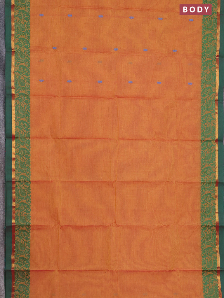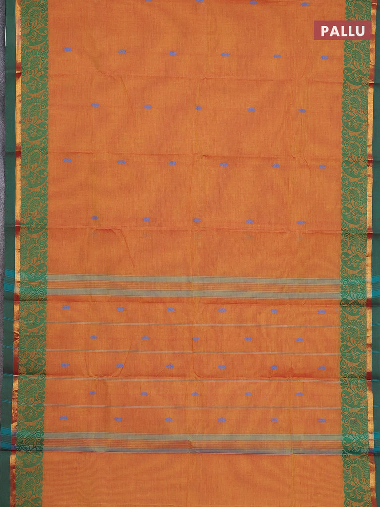 Chettinad cotton saree green and mustard with thread woven buttas and rattapet zari woven border