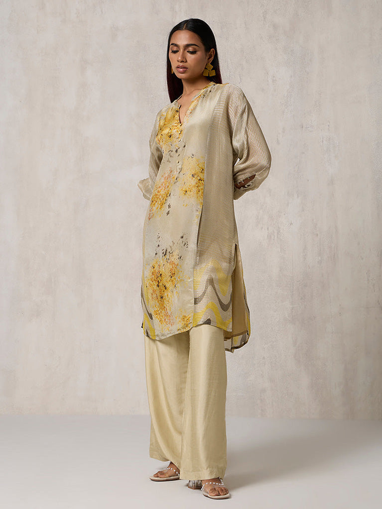 Where art meets craft, this beige kurta pairs painterly watercolour prints with wavy mustard stripes for a contemporary twist. Crafted in a sheer, textured fabric with subtle woven lines, it features a banded collar, three-quarter sleeves, and side pockets for effortless functionality. A modern kurta that flows with ease from quiet mornings to festive evenings.