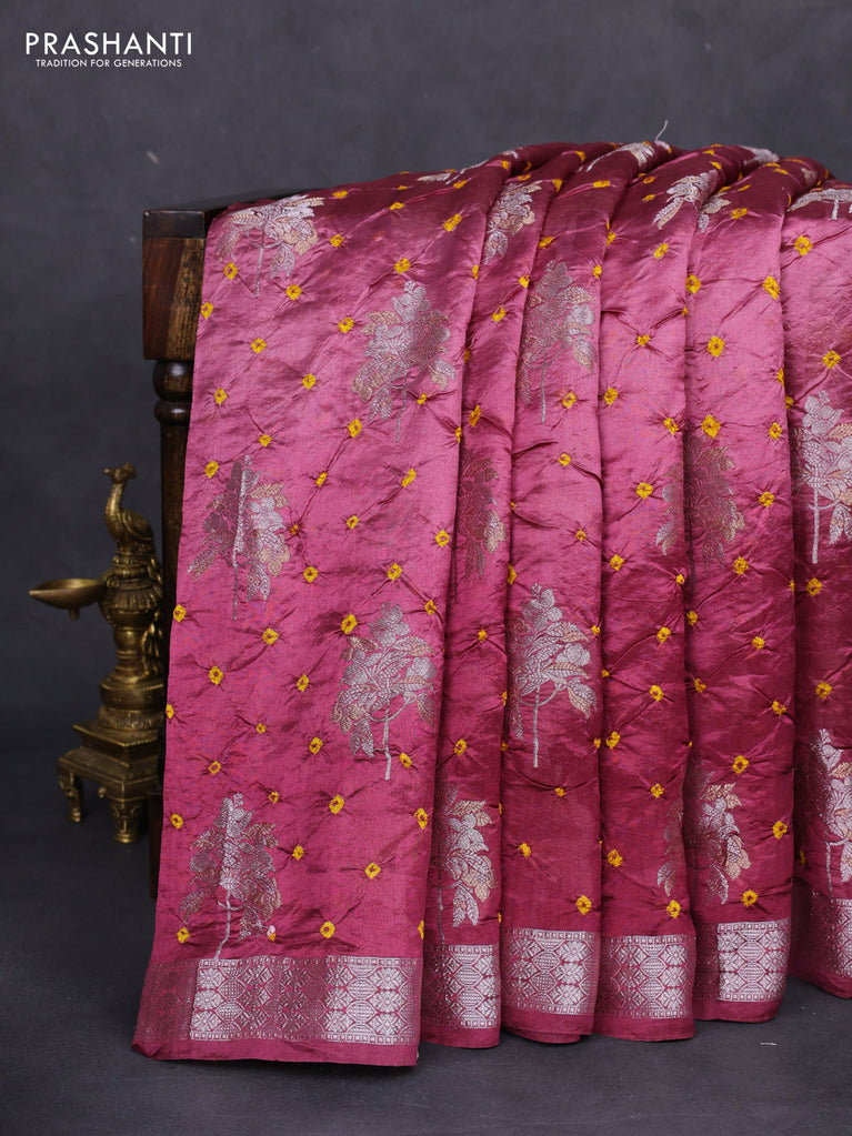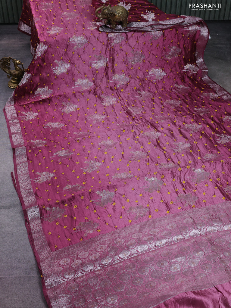 Chiniya silk saree mauve pink with allover silver zari buttas & bandhini prints and silver zari woven border