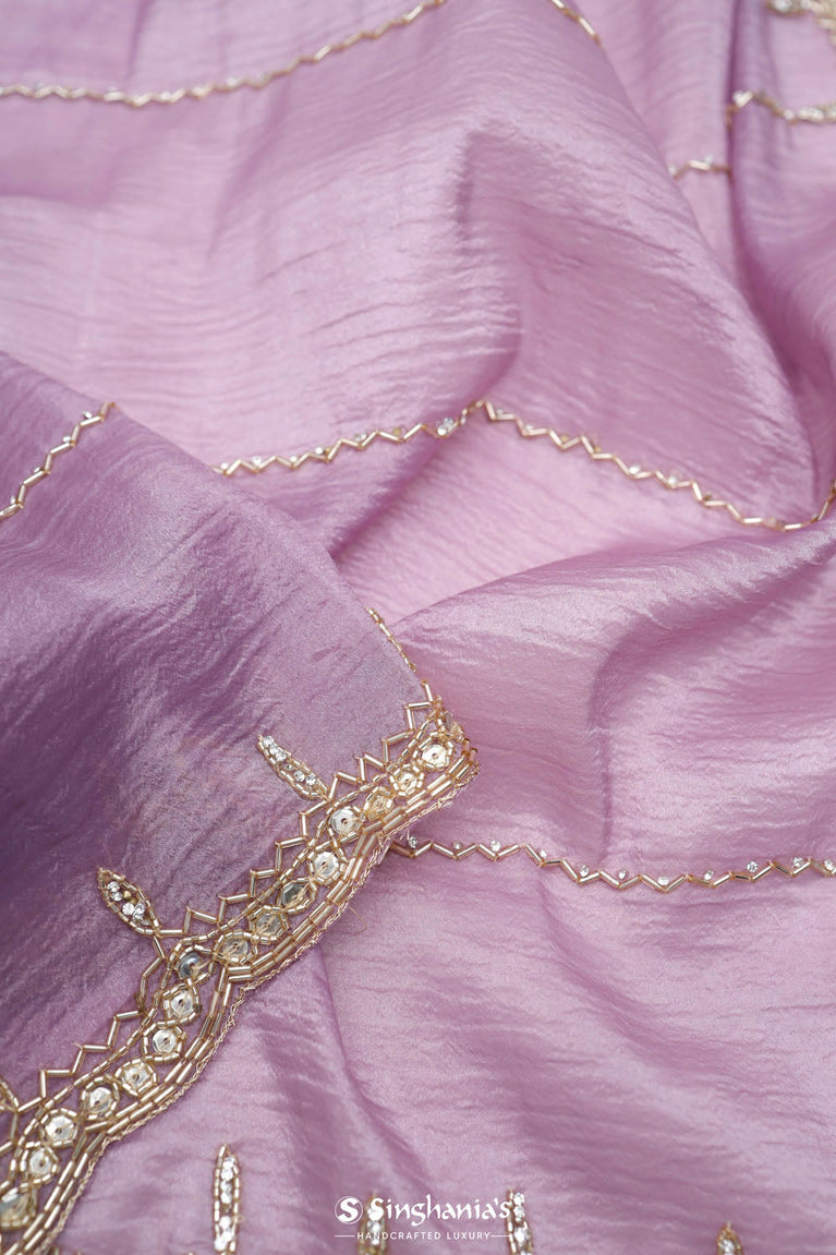 This beautiful african violet tissue saree is ideal for weddings and festive celebrations. The intricate stripes embroidery in glass beads and sequins crafted designs, which are enhanced by a delicate floral border, creating a luxurious and refreshing look.