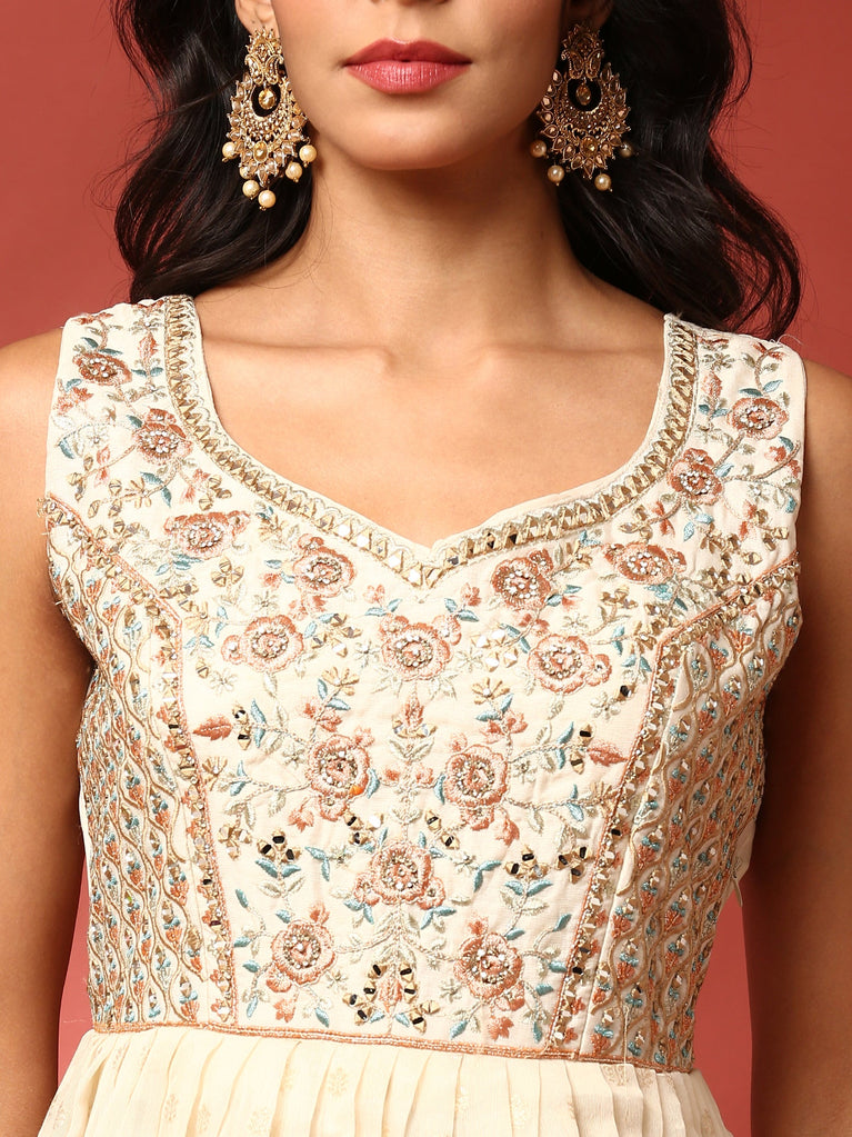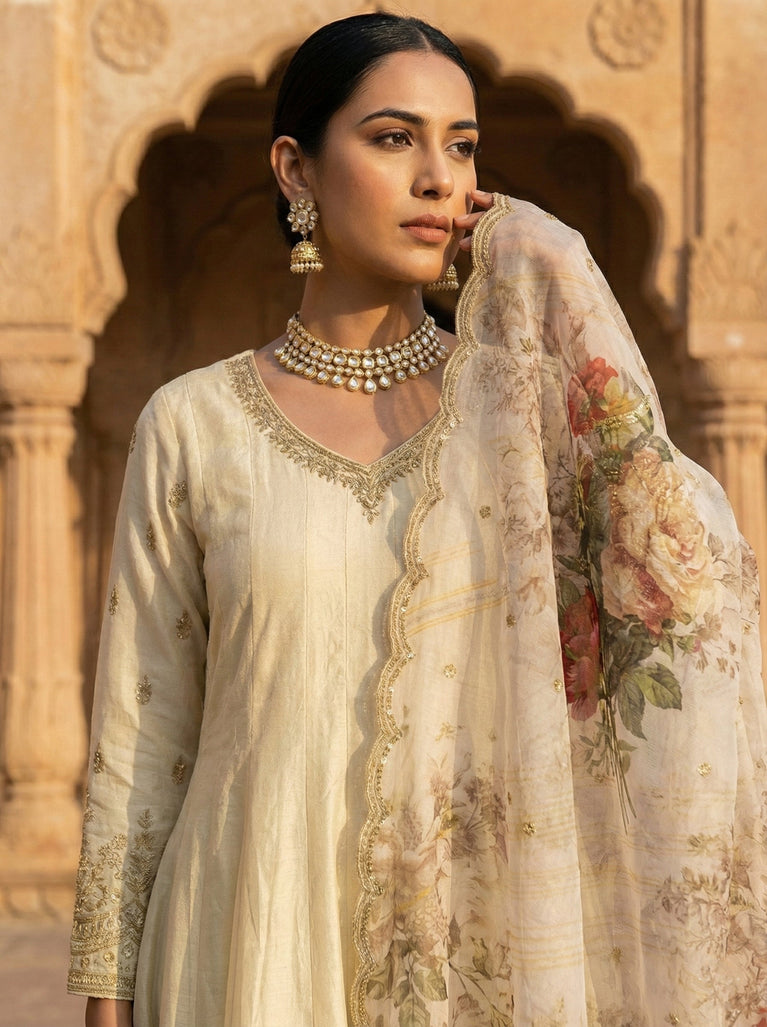 Elevate your ethnic wardrobe with this stunning cream tissue Anarkali set, beautifully adorned with delicate floral embroidery. The lightweight fabric drapes gracefully, offering comfort for both festive occasions and celebrations. The intricate embroidered details add a touch of sophistication and timeless elegance to your look. Perfect for weddings, parties, or cultural events, this set combines traditional craftsmanship with contemporary style. The cream tone complements all skin tones, making it a versatile choice for any complexion. Embrace the charm of classic Indian fashion with this exquisite piece that celebrates artistry and grace.