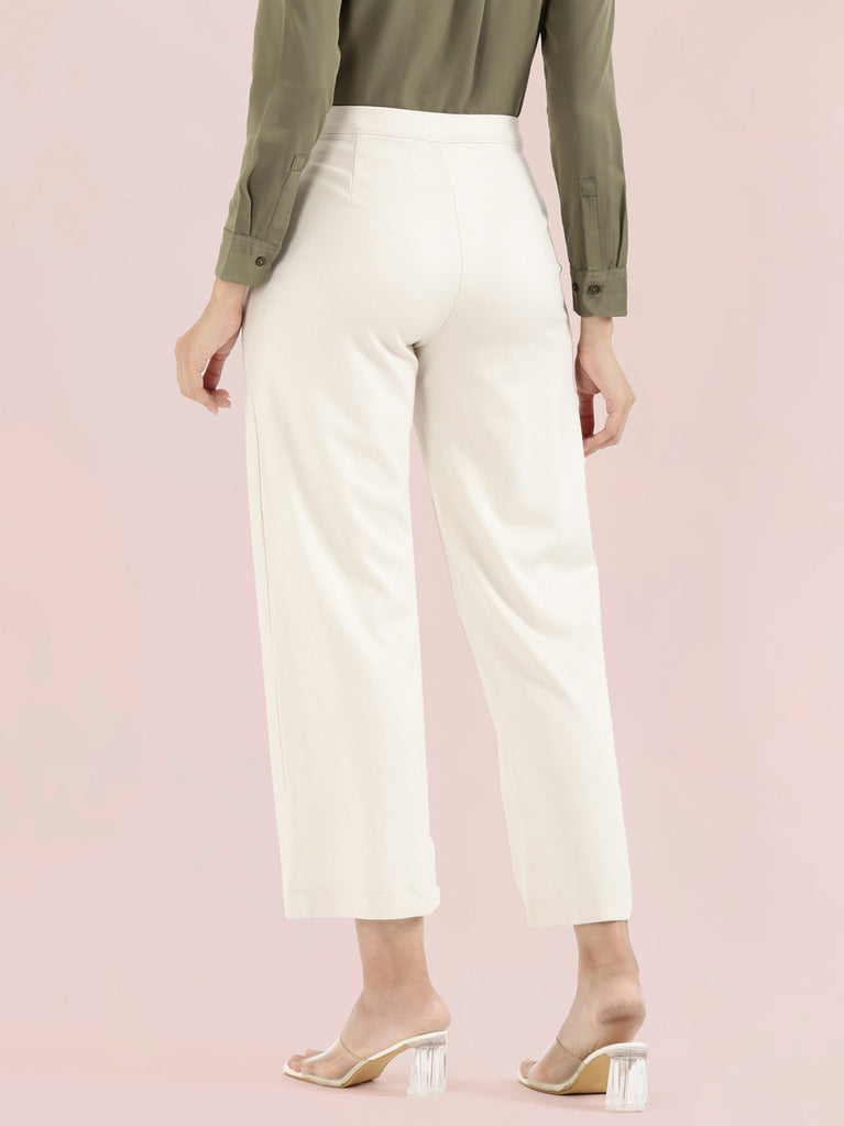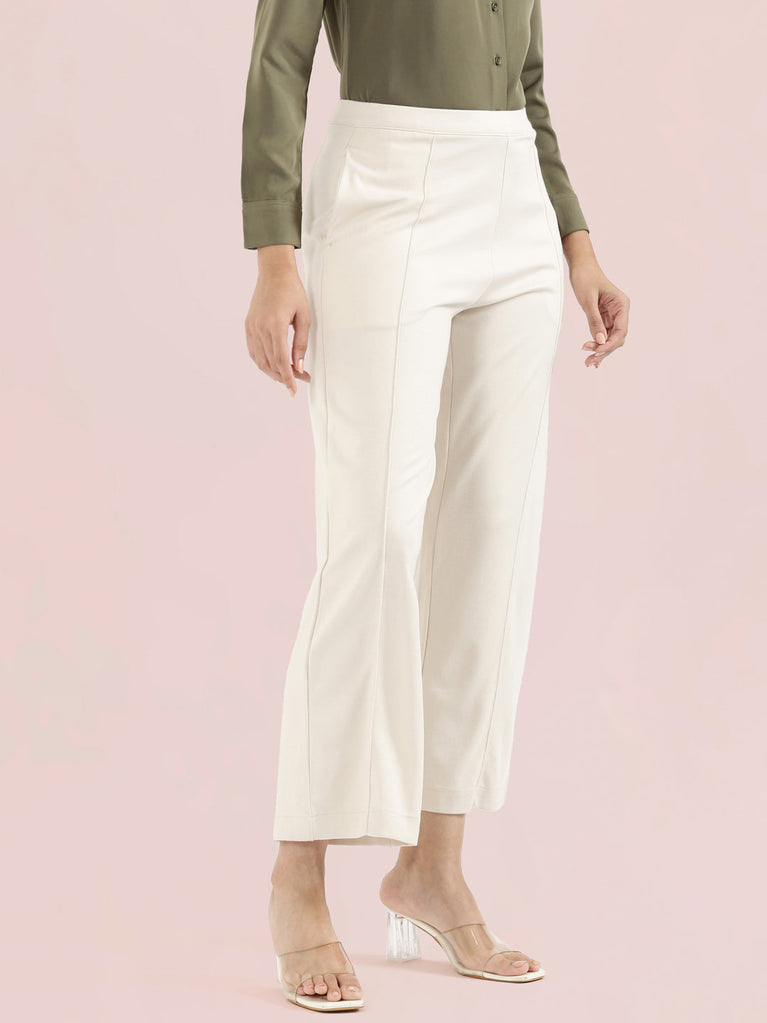 Wear a crisp white button down or a tee our Solid Cream Ponte Pants are the perfect pair to team it up with. Made from stretch viscose, nylon & elastane fabric, it has elasticised waistband, slant pockest & slim fit.
