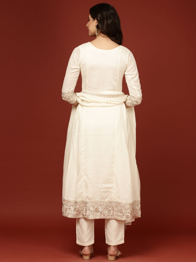Elevate your ethnic wardrobe with this exquisite cream silk three-piece ensemble, meticulously crafted with intricate hand embroidery. Each piece showcases traditional artistry combined with luxurious silk fabric, offering unparalleled comfort and sophistication. Perfect for weddings, festivals, and special occasions, this set brings timeless elegance to your collection. The delicate embroidery work adds a touch of refined beauty, while the cream tone ensures versatility with your existing accessories. Invest in quality craftsmanship that celebrates heritage and style.