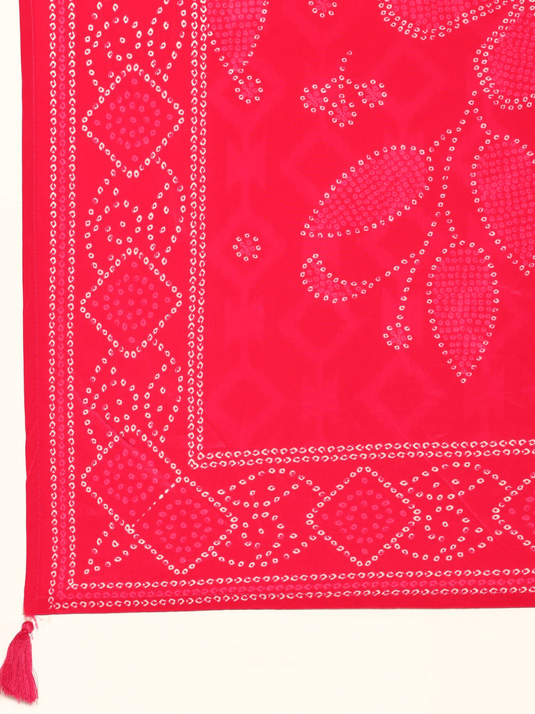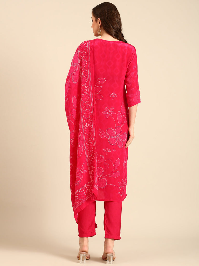 Elevate your ethnic wardrobe with this stunning Rani pink crepe three-piece suit set featuring traditional bandhani print. The graceful round neck is adorned with kardhana and intricate mirror work, adding a touch of sparkle to the vibrant floral design. Crafted from soft crepe fabric, this outfit offers both comfort and elegance, perfect for festive occasions or special gatherings.
