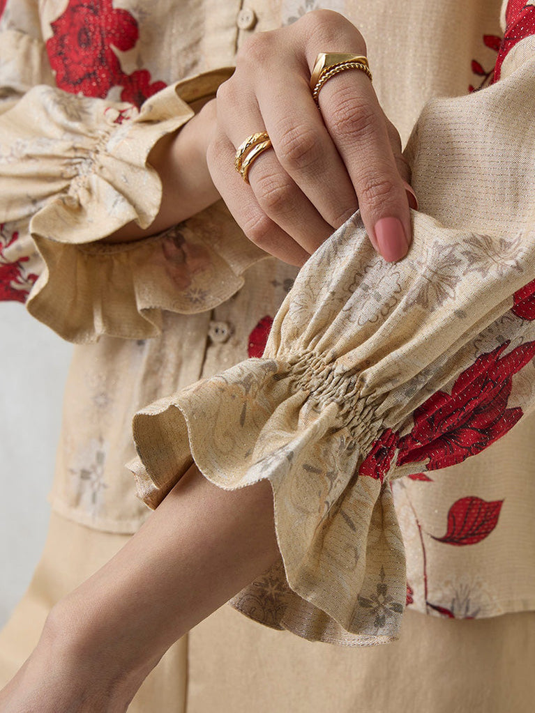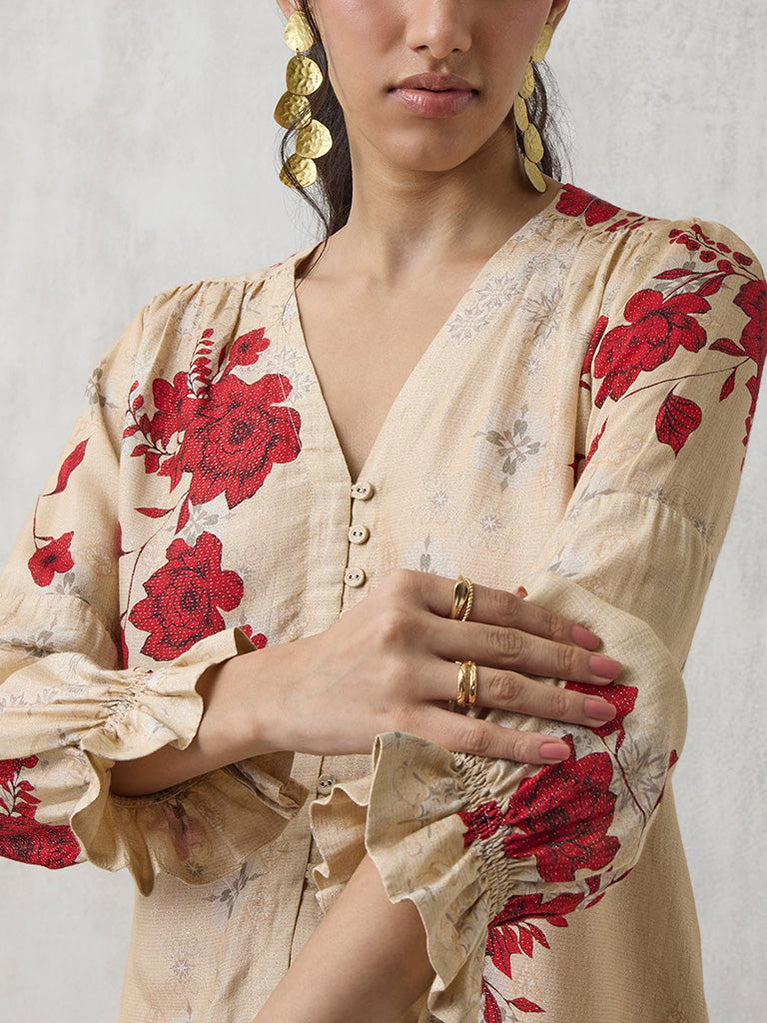 Refresh your wardrobe with this beige blouse, featuring elegant floral motifs over the lightweight fabric. The classic V-neckline, button-fastened front and full length flounce sleeves lend timeless appeal.