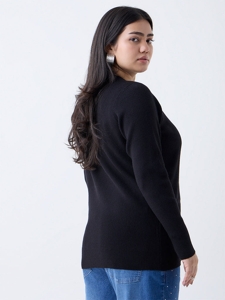 Gia launches this black sweater with a fashion-forward cut-out design that adds striking appeal. The ribbed knit fabric ensures stretch and comfort, while the round neck and full sleeves keep the profile sleek and wearable.