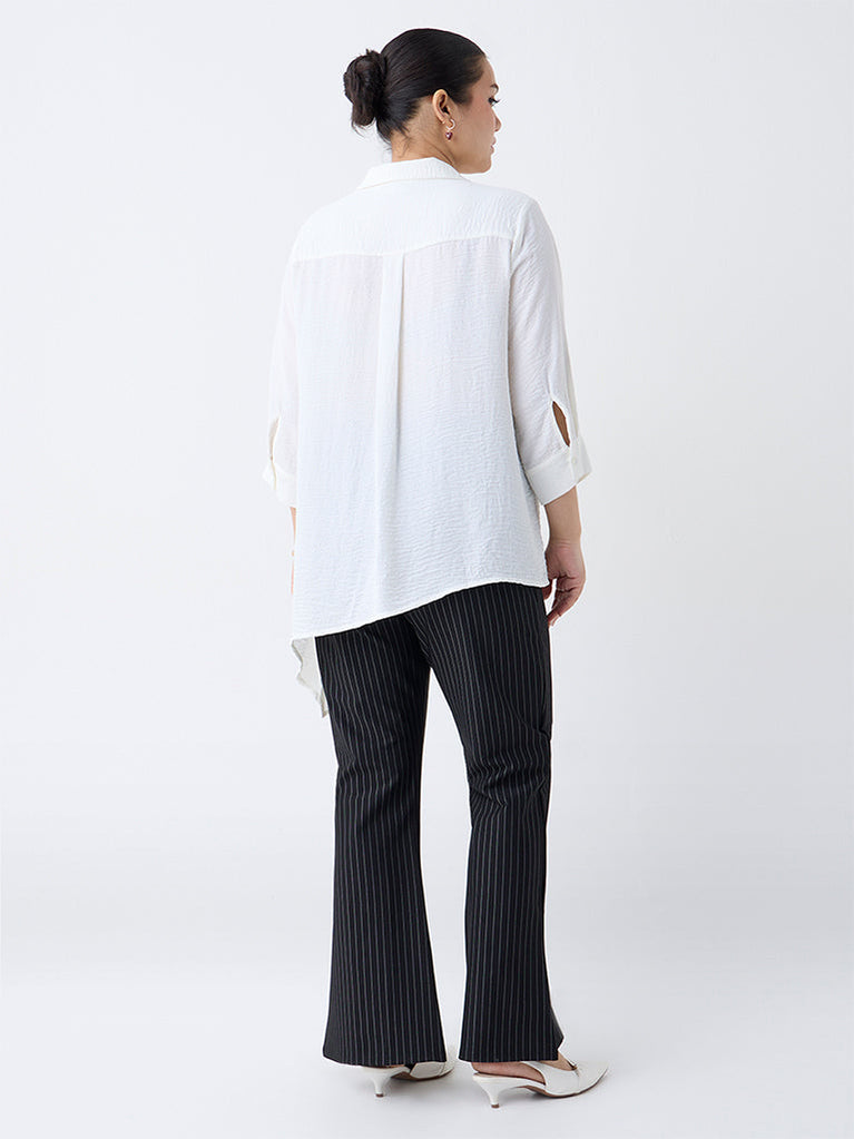 Crafted in a classic black hue, this stretchable top by Gia features delicate pearlescent detailing along the spread collar for an elegant touch. Designed in a soft fabric with full sleeves, it offers a refined silhouette that transitions seamlessly from workwear to evening outings.